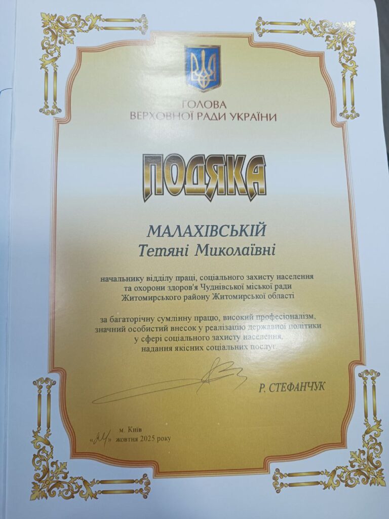 Подяку Голови Верховної Ради України отримала начальник відділу праці, соціального захисту населення та охорони здоров’я Чуднівської міської ради Тетяна Малахівська.