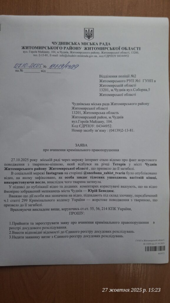 Заяву зареєстровано і передано до поліції для перевірки та притягнення винних до відповідальності згідно із законодавством, інформують в Чуднівській міській раді.